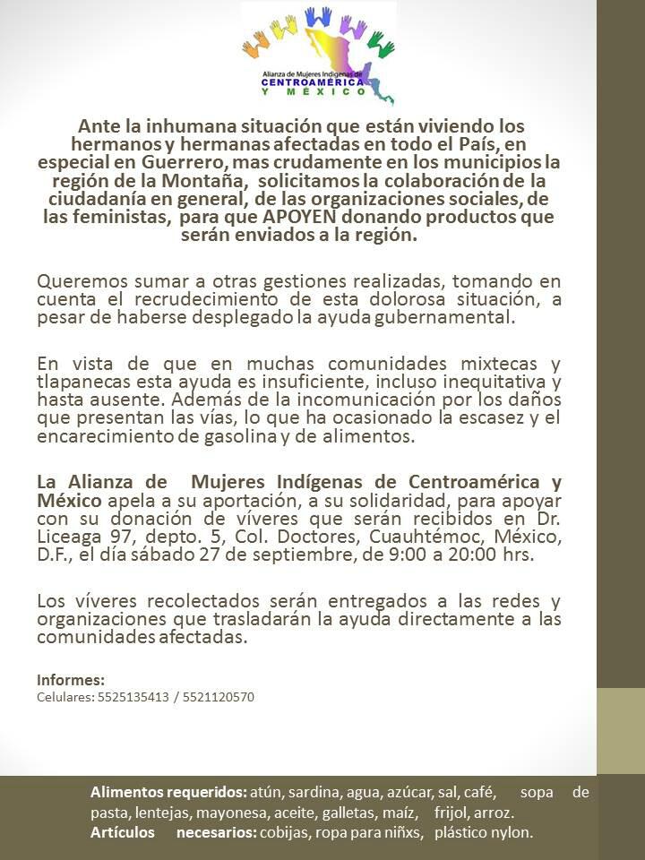De favor apoyanos difundiendo este comunicado para el acopio de víveres para la región Montaña de Guerrero !! Gracias